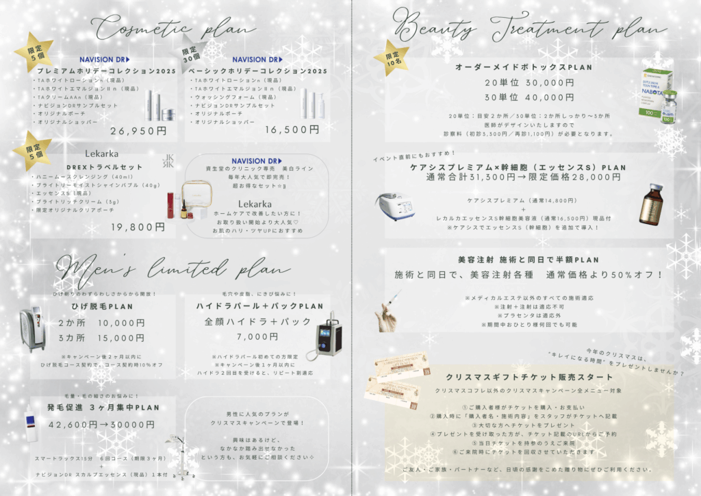 毎年大人気のクリスマスキャンペーン🎁ついに明日から全メニューの予約が始まります。クリスマスだけの特別なキャンペーン、ワクワクしますね。個数限定のコスメ&人数限定の施術プランは売り切れ必至、お早めのご予約をオススメします。